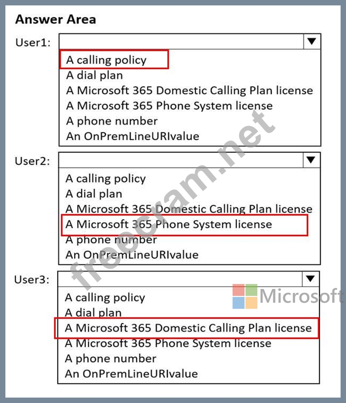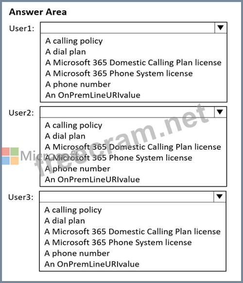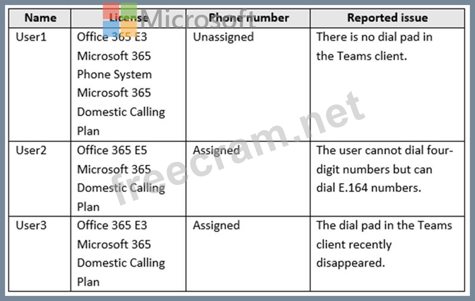 You are deploying Microsoft Teams Calling Plans to three users as shown in the following table.