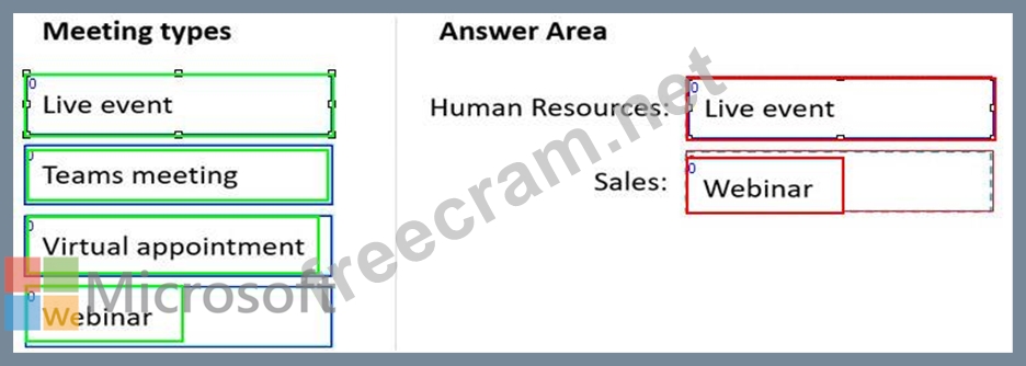 What should you recommend for each team? To answer, drag the meeting types to the correct teams Each meeting type may be used once, more than once, or not at all. You may need to drag the split bar between panes or scroll to view content.