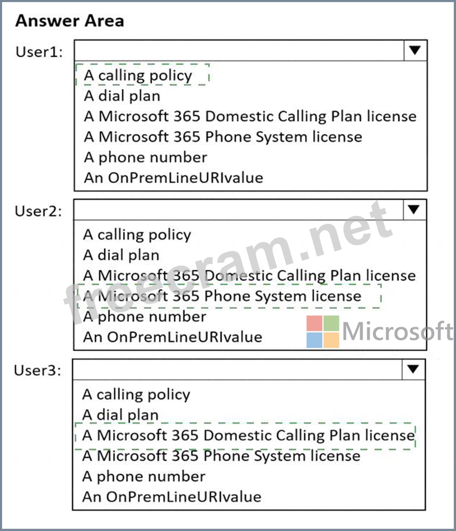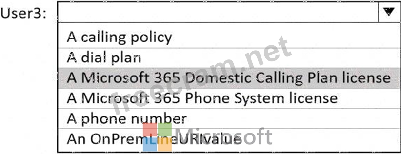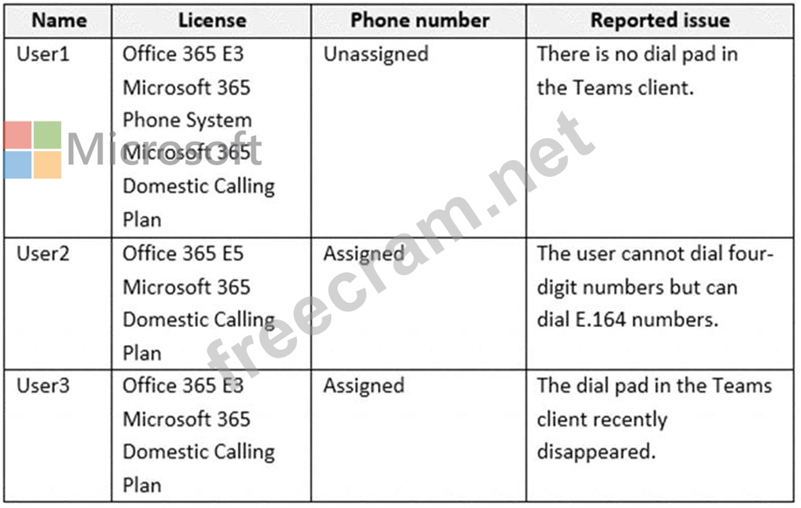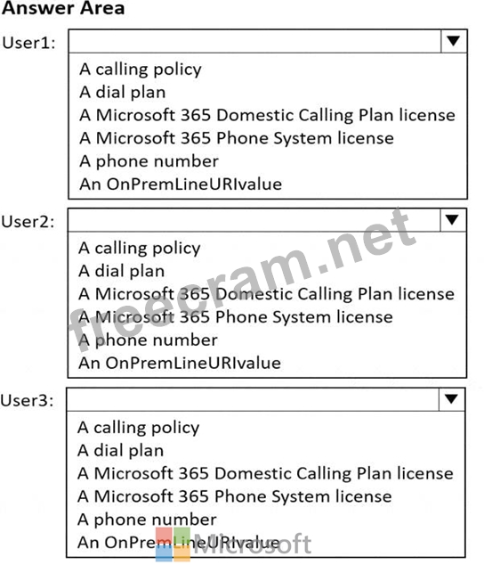 You are deploying Microsoft Teams Calling Plans to three users as shown in the following table.