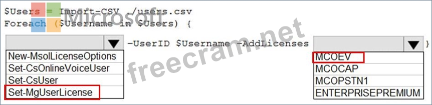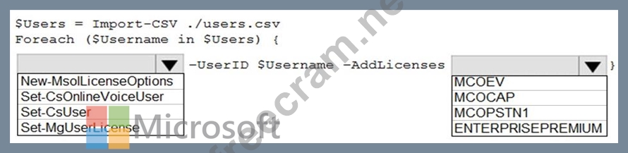 How should you complete the PowerShell script? To answer, select the appropriate options in the answer area.