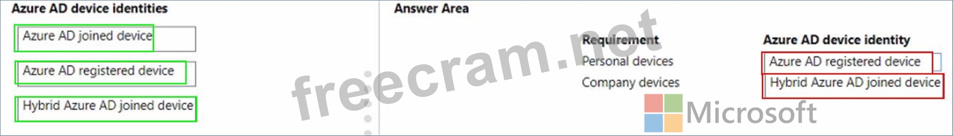 What should you use? To answer, drag the appropriate Azure AD device identities to the correct requirements. Each Azure AD device identity may be used once, more than once. or not at all. You may need to drag the split bar between panes or scroll to view content.