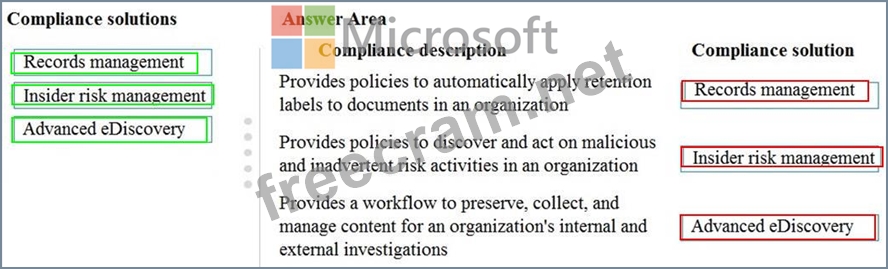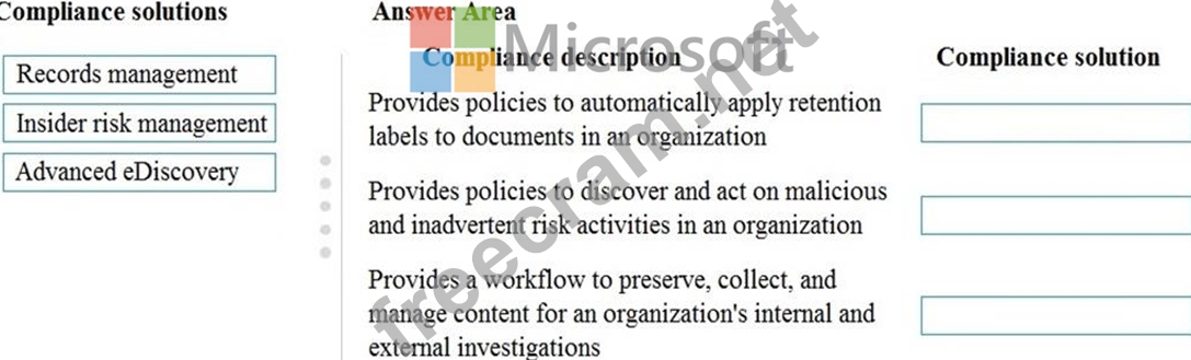 Match each compliance solution to its description. To answer, drag the appropriate compliance solution from the column on the left to its description on the right. Each compliance solution may be used once, more than once, or not at all.
