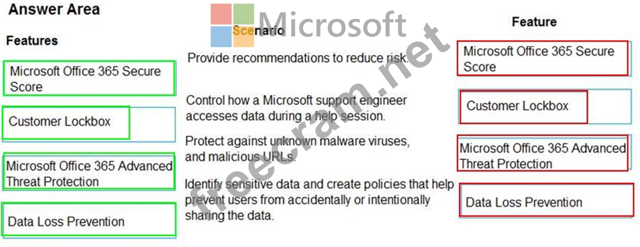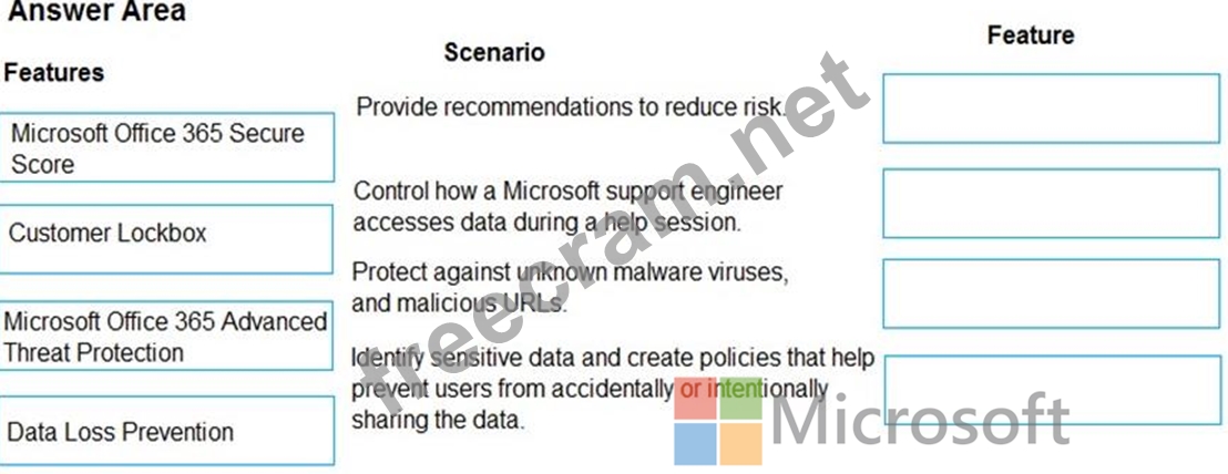 Which features should you implement? To answer, drag the appropriate features to the correct scenarios. Each feature may be used once, more than once, or not at all. You may need to drag the split bar between panes or scroll to view content.