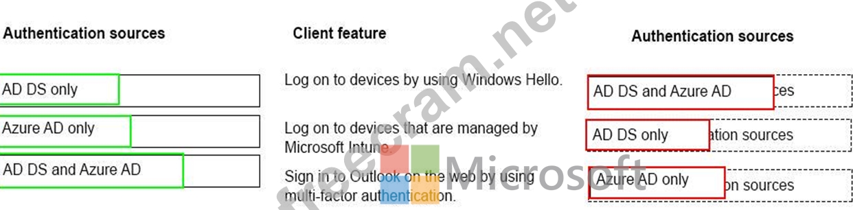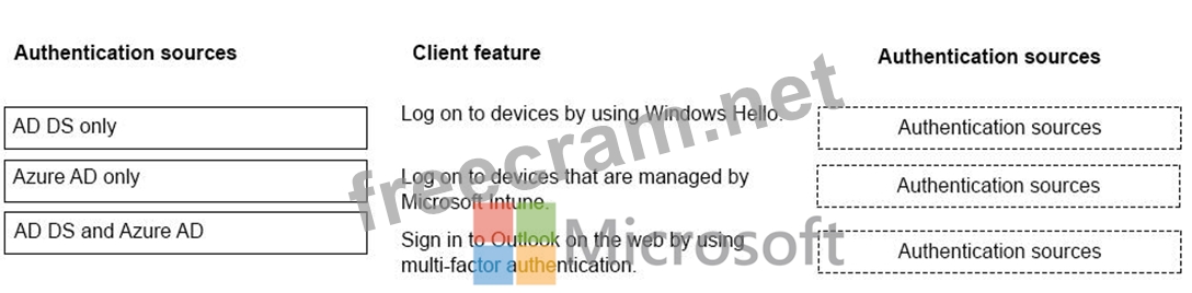 Match each feature to its authentication source. To answer, drag the appropriate authentication sources from the column on the left to the client features on the right. Each authentication source may be used once, more than once, or not at al.