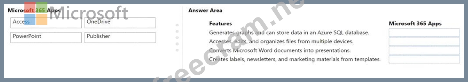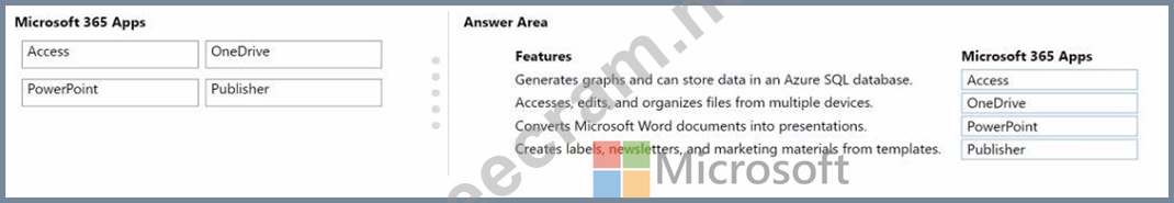 Which application should you use? To answer, drag the appropriate Microsoft 365 Apps applications to the correct features. Each Microsoft 365 Apps application may be used once, more than once, or not at all. You may need to drag the split bar between panes or scroll to view content.