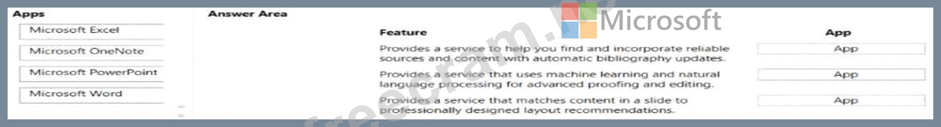 Which Microsoft 365 Apps apps should you use? To answer, drag. the appropriate apps to the correct features. Each app may be used once, more than once, or not at all. You may need to drag the split bar between panes or scroll to view content.