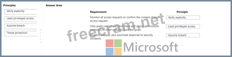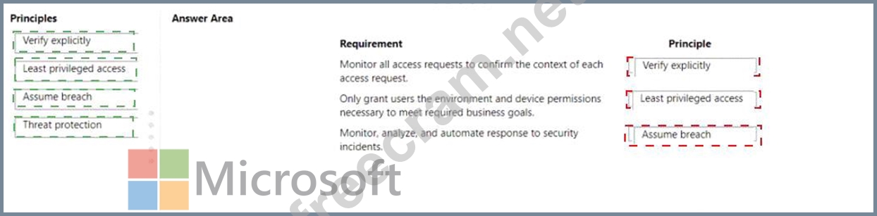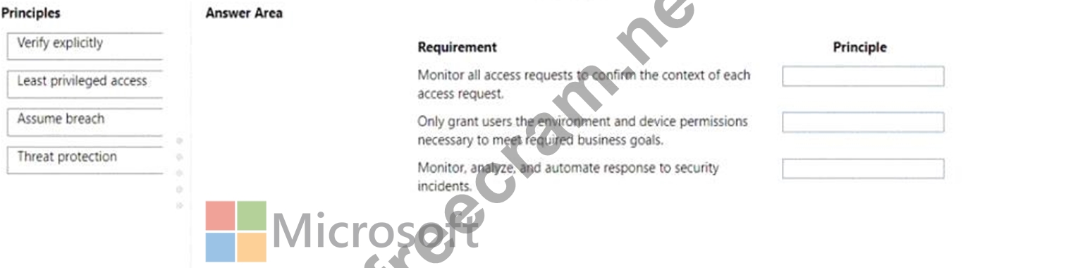 Which Zero Trust security principle should you recommend? To answer, drag the appropriate principles to the correct requirements. Each principle may be used once, more than once, or not at all. You may need to drag the split bar between panes or scroll to view content NOTE: Each correct selection I worth one point.