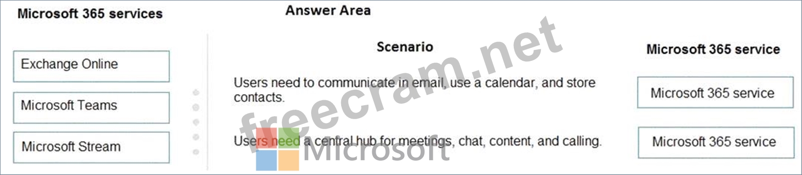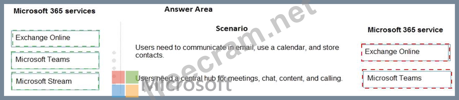 Match each scenario to its Microsoft 365 service. To answer, drag the appropriate Microsoft 365 service from the column on the left to its scenario on the right. Each Microsoft 365 service may be used once, more than once, or not at all.