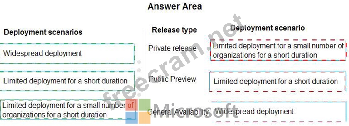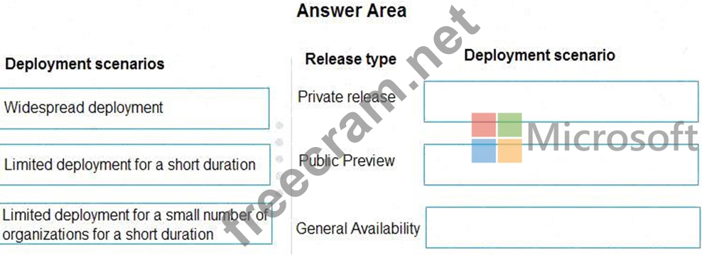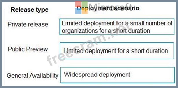 Match each deployment scenario appropriate release type. To answer, drag the appropriate deployment scenarios to the correct release types. Each deployment scenario may be used once, more than once, or not at all. You may need to drag the split bar between panes or scroll to view content.
