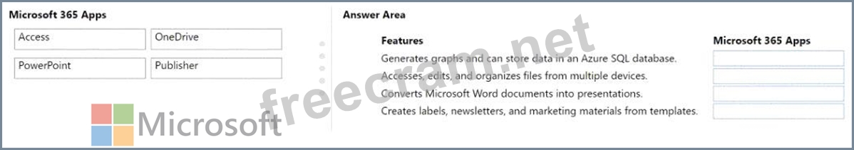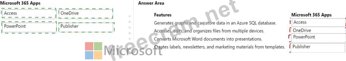 Which application should you use? To answer, drag the appropriate Microsoft 365 Apps applications to the correctfeatures. Each Microsoft 365 Apps application may be used once, more than once, or not at all. You may need to drag the split bar between panes or scroll to view content.