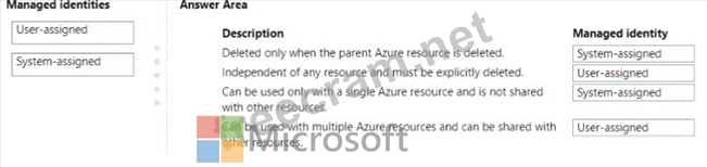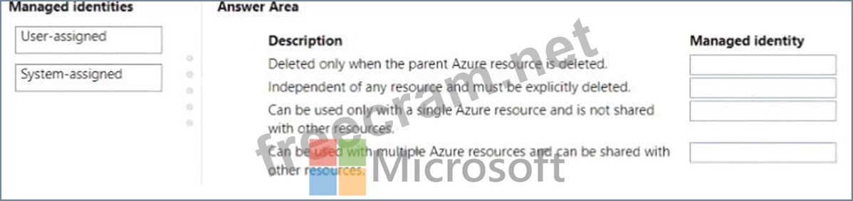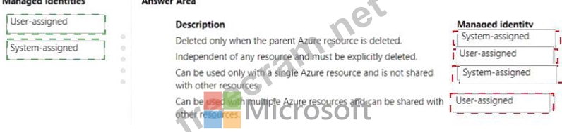 Whichmanaged identities should you describe? To answer, drag the appropriate managed identities to the correct descriptions. Each managed identity may be used once, more than once, or not at all. You may need to drag the split bar between panes or scroll to view content.