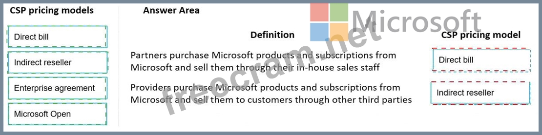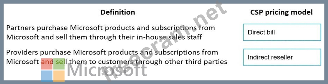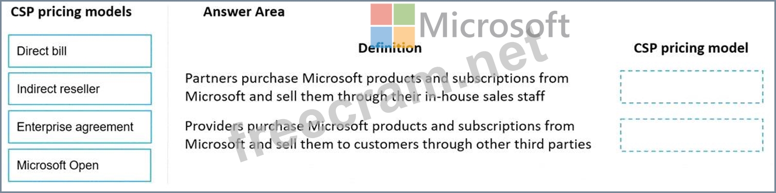 Instructions: To answer, drag the appropriate CSP pricing model from the column on the left to the definition on the right. Each CSP pricing model might be used once, more than once, or not at all.
