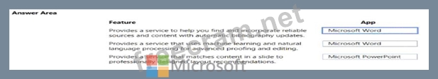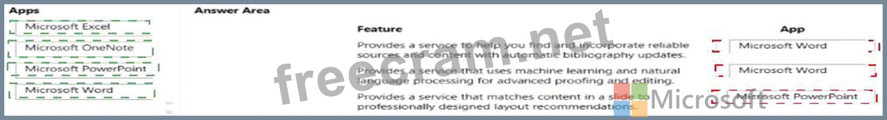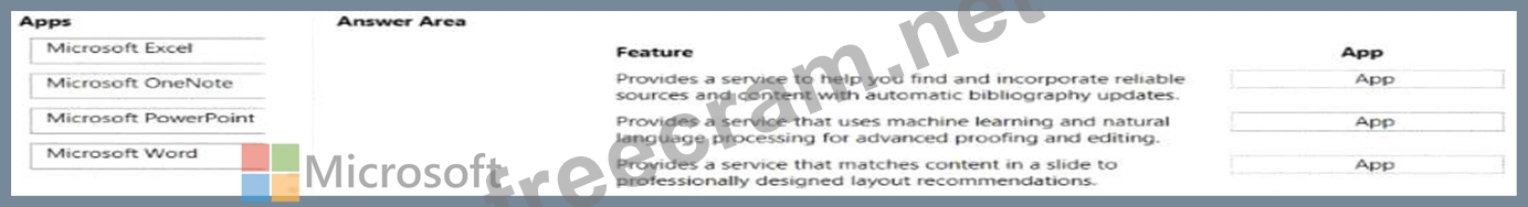Which Microsoft 365 Apps apps should you use? To answer, drag. the appropriate apps to the correct features. Each app may be used once, more than once, or not at all. You may need to drag the split bar between panes or scroll to view content.
