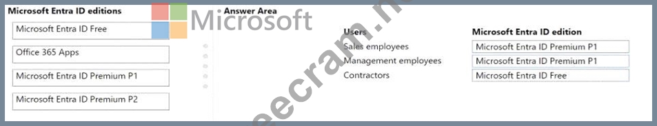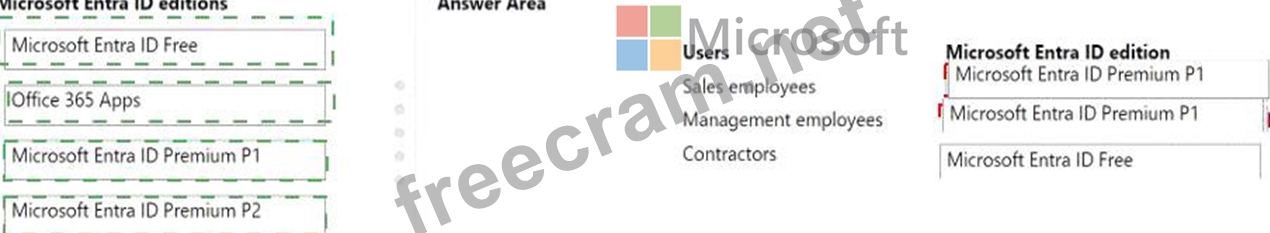 What should you use? To answer, drag the appropriate Microsoft Entra ID editions to the correct users. Each Microsoft Entra ID edition may be used once, more than once, or not at all. You may need to drag the splitbar between panes or scroll to view content.