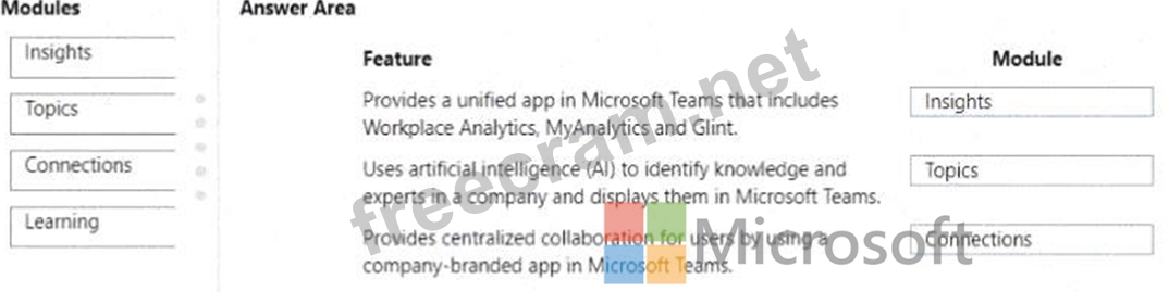 Which module should you use? To answer, drag the appropriate modules to the correct features. Each module may be used once, more than once, of not at all. You may need to drag the split bar between panes or scroll to view content NOTE: Each correct selection is worth one point.