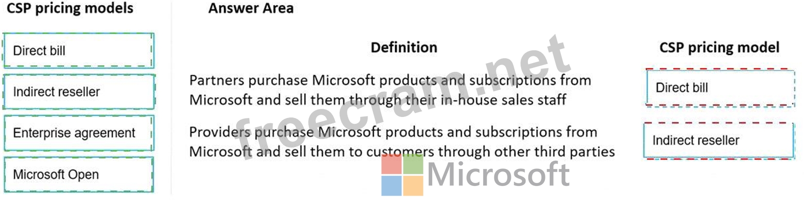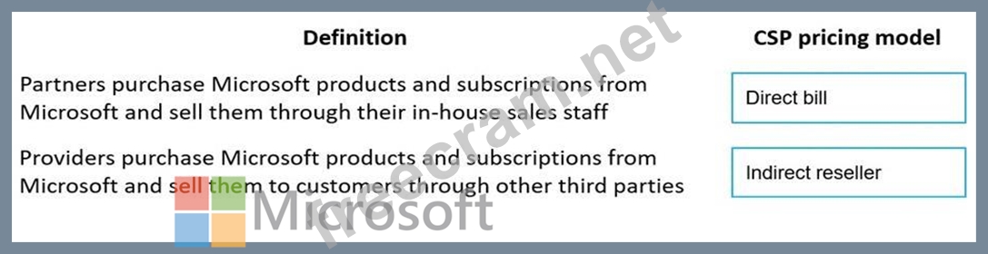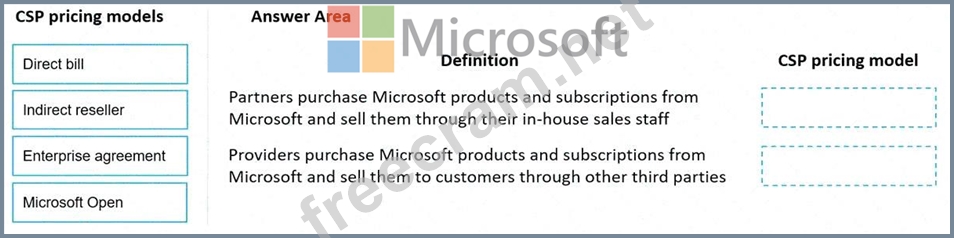 Instructions: To answer, drag the appropriate CSP pricing model from the column on the left to the definition on the right. Each CSP pricing model might be used once, more than once, or not at all.