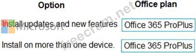 Which Office plans should you use? To answer, drag theappropriate Office plans to the correct options. Each Office plan may be used once, more than once, or not at all. You may need to drag the split bar between panes or scroll to view content.
