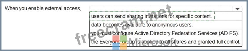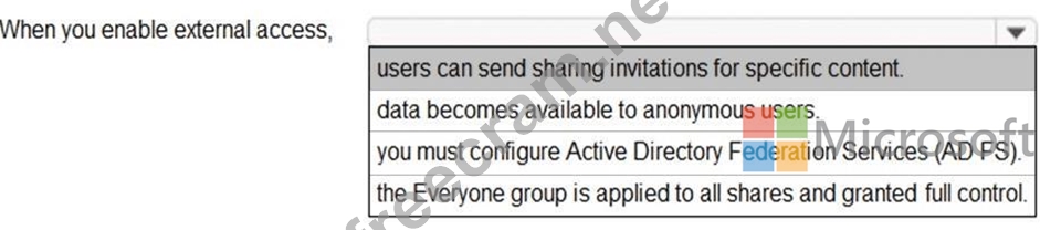 What happens when you enable external access by using the Microsoft 365 admin portal? To answer, select the appropriate options in the answer area.