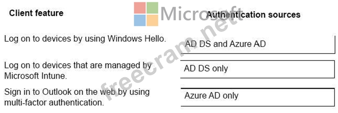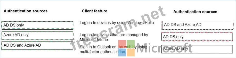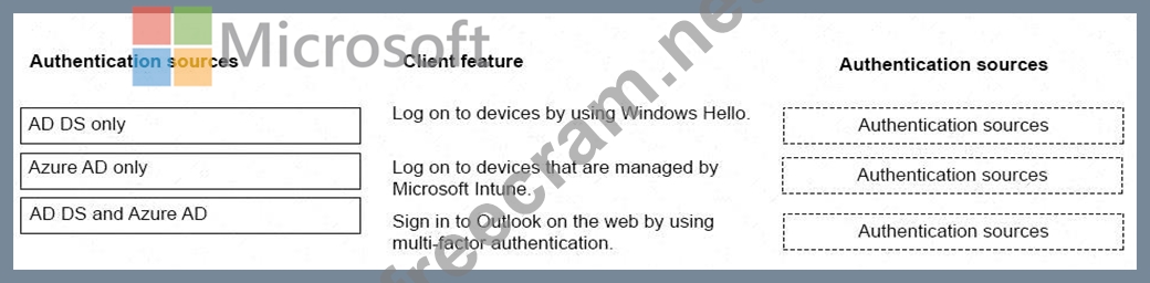 Match each feature to its authentication source. To answer, drag the appropriate authentication sources from the column on the left to the client features on the right. Each authentication source may be used once, more than once, or not at al.