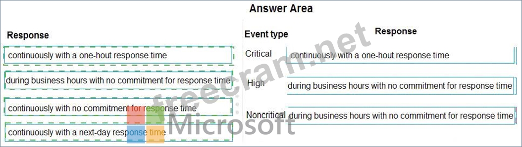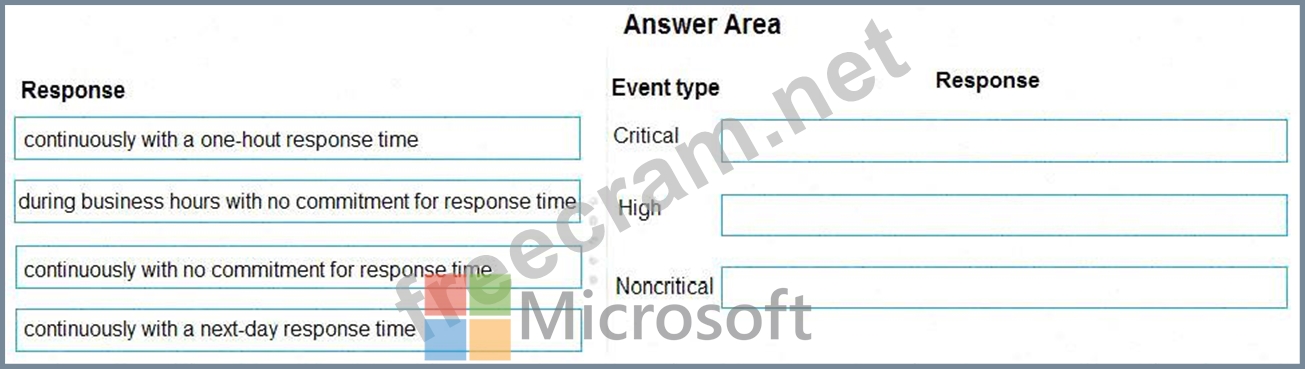 What response can you expect for each event type? To answer, drag the appropriate responses to the correct event types. Each response may be used once, more than once, or not at all. You may need to drag the split bar between panes or scroll to view content.