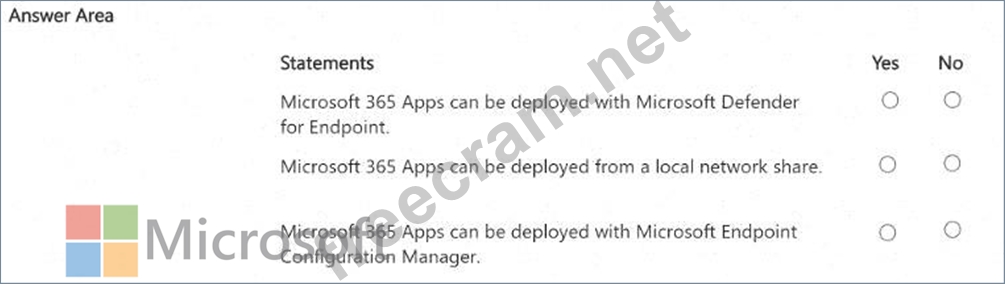 * Explanation: Microsoft Defender for Endpoint is a security solution used for threat protection, not a deployment tool for Microsoft 365 Apps.