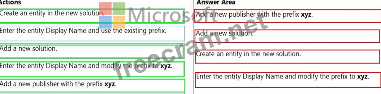 You are configuring a new Common Data Service environment by using the Power Apps Maker portal. You need to create an entity that uses the prefix xyz. Which four actions should you perform in sequence? To answer, move the appropriate actions from the list of actions to the answer area and arrange them in the correct order.