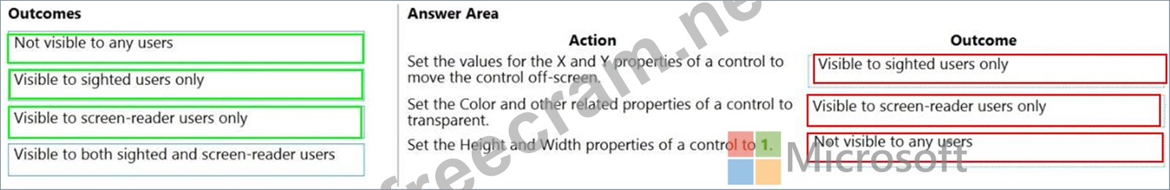 You are designing a canvas app that will be used by all users including users who have vision impairments. Which outcome is achieved by each action? To answer, drag the appropriate outcomes to the correct actions. Each outcome may be used once, more than once, or not at all. You may need to drag the split bar between panes or scroll to view content. NOTE: Each correct selection is worth one point.