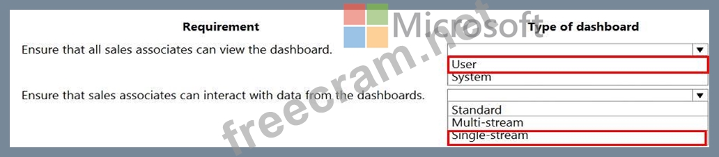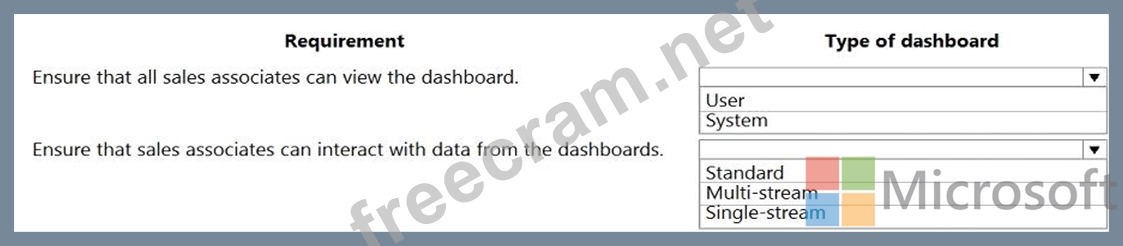 Which type of dashboards should you create? To answer, select the appropriate options in the answer area.
