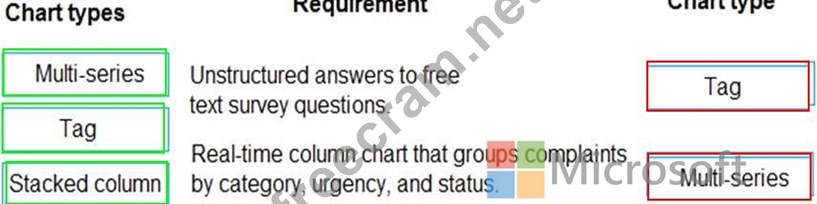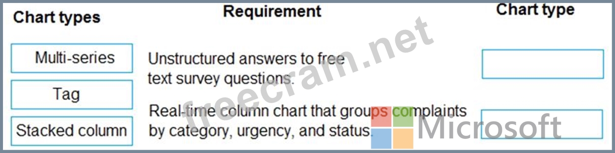 Which chart type should you use? To answer, drag the appropriate chart type to the correct requirements. Each chart type may be used once, more than once, or not at all. You may need to drag the split bar between panes or scroll to view content.