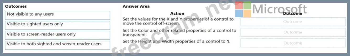 Which outcome is achieved by each action? To answer, drag the appropriate outcomes to the correct actions. Each outcome may be used once, more than once, or not at all. You may need to drag the split bar between panes or scroll to view content.