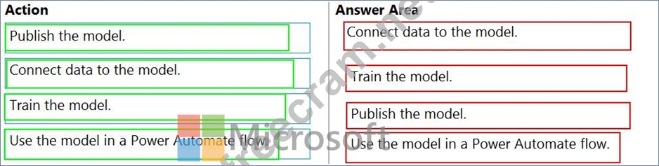 A company uses Power Automate and Power Apps to streamline business processes. You need to use AI Builder to analyze customer reviews of the company's products. In which order should you perform the actions? To answer, move all actions from the list of actions to the answer area and arrange them in the correct order.