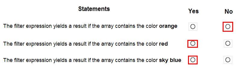 You have an array that contains items with different color attributes. You plan to filter the array by using the following filter expression within the flow: