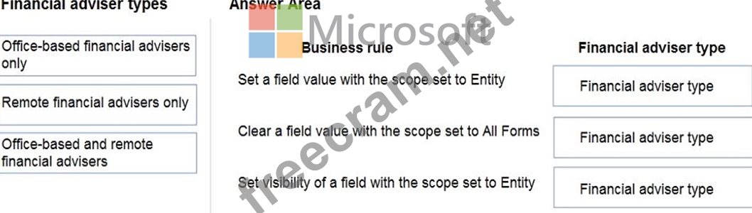To answer, drag the appropriate financial adviser types to the correct business rules. Each financial adviser type may be used once, more than once, or not at all. You may need to drag the split bat between panes or scroll to view content.