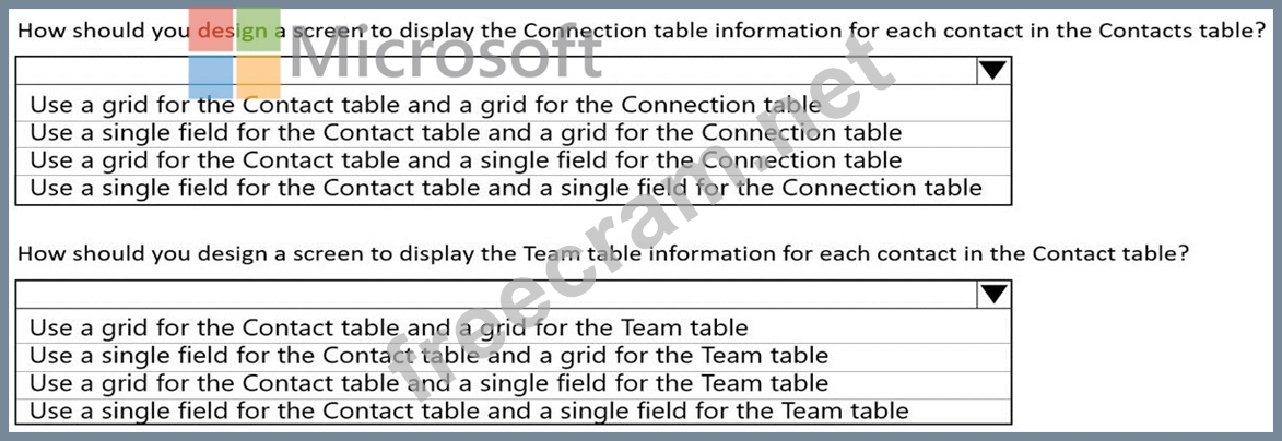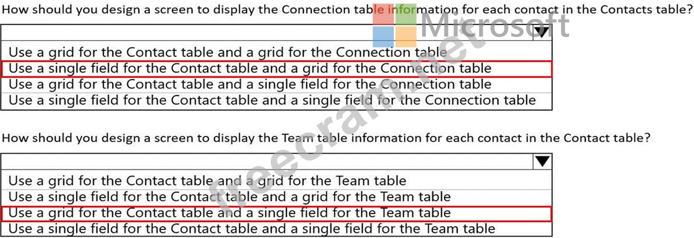 A user needs to understand which data they can make available for the 500 contacts that are present in the Contact table. All relevant data must be shown in the app. Single fields must show one record and grids must show multiple records. Only the primary fields for each related table should be shown for a contact.