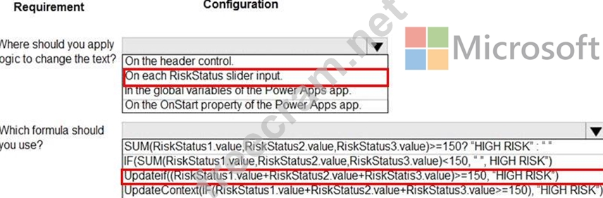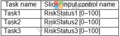 Users assign three tasks a risk status on a scale of 0 to 100 by using slider input controls named RiskStatus on the app. The highest risks use the risk status value of 100.