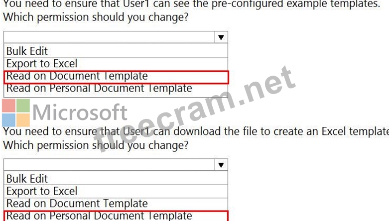 You create a security role named TemplateAdministrator and configure the role as shown below and assign the role to a user named User1.