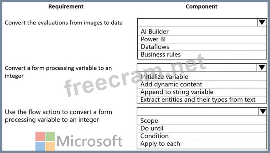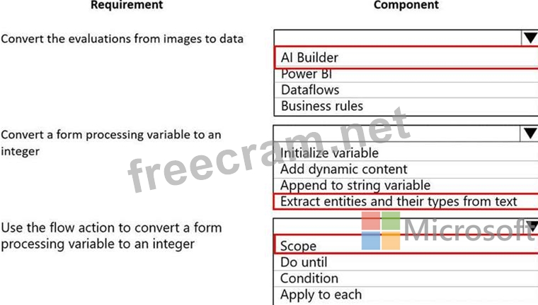 The company must scan completed performance evaluations into a Common Data Service entity by using a Power Apps app. The information in the documents must automatically map to entities and convert into quantifiable information.