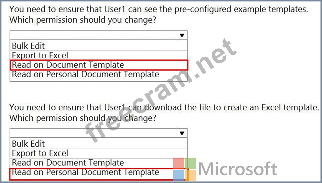 You create a security role named TemplateAdministrator and configure the role as shown below and assign the role to a user named User1.