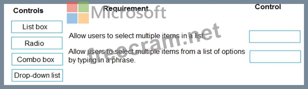 Which control should you use? To answer, drag the appropriate controls to the correct requirements. Each control may be used once, more than once, or not at all. You may need to drag the split bar between panes or scroll to view content.