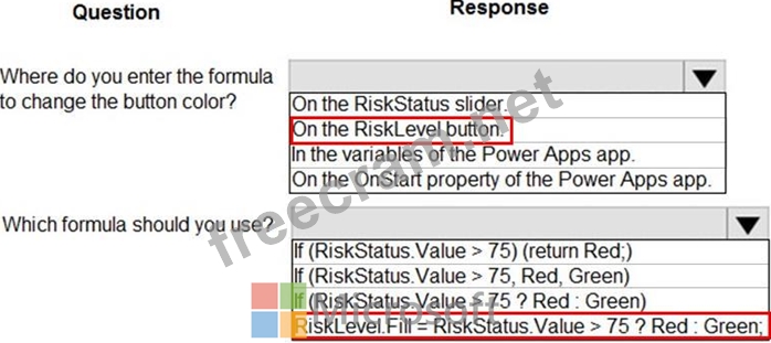For each task, the user selects a button named RiskLevel to send the name of the task and RiskStatus number to key project stakeholders. The color of the button must change to the color listed in the following table based on the value of the RiskStatus control. The default color for the button is green.