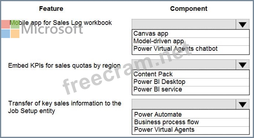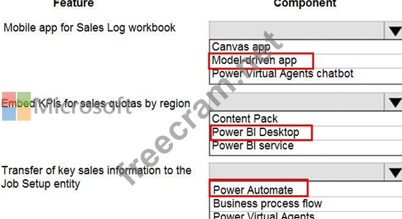 Which Power Platform component should you use for each feature? To answer, select the appropriate options in the answer area.