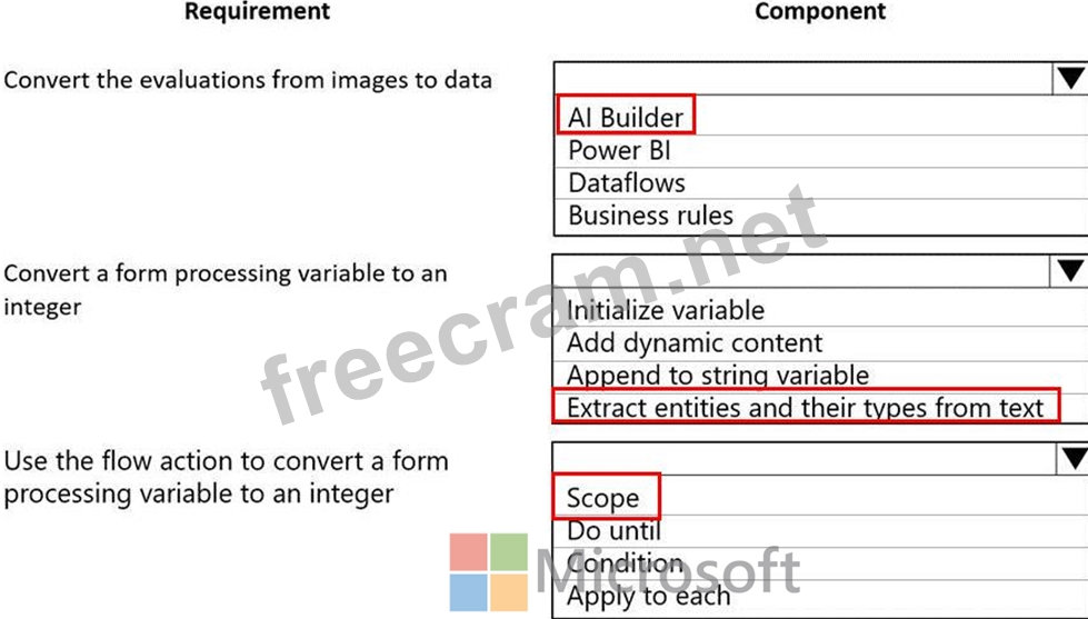 The company must scan completed performance evaluations into a Common Data Service entity by using a Power Apps app. The information in the documents must automatically map to entities and convert into quantifiable information.