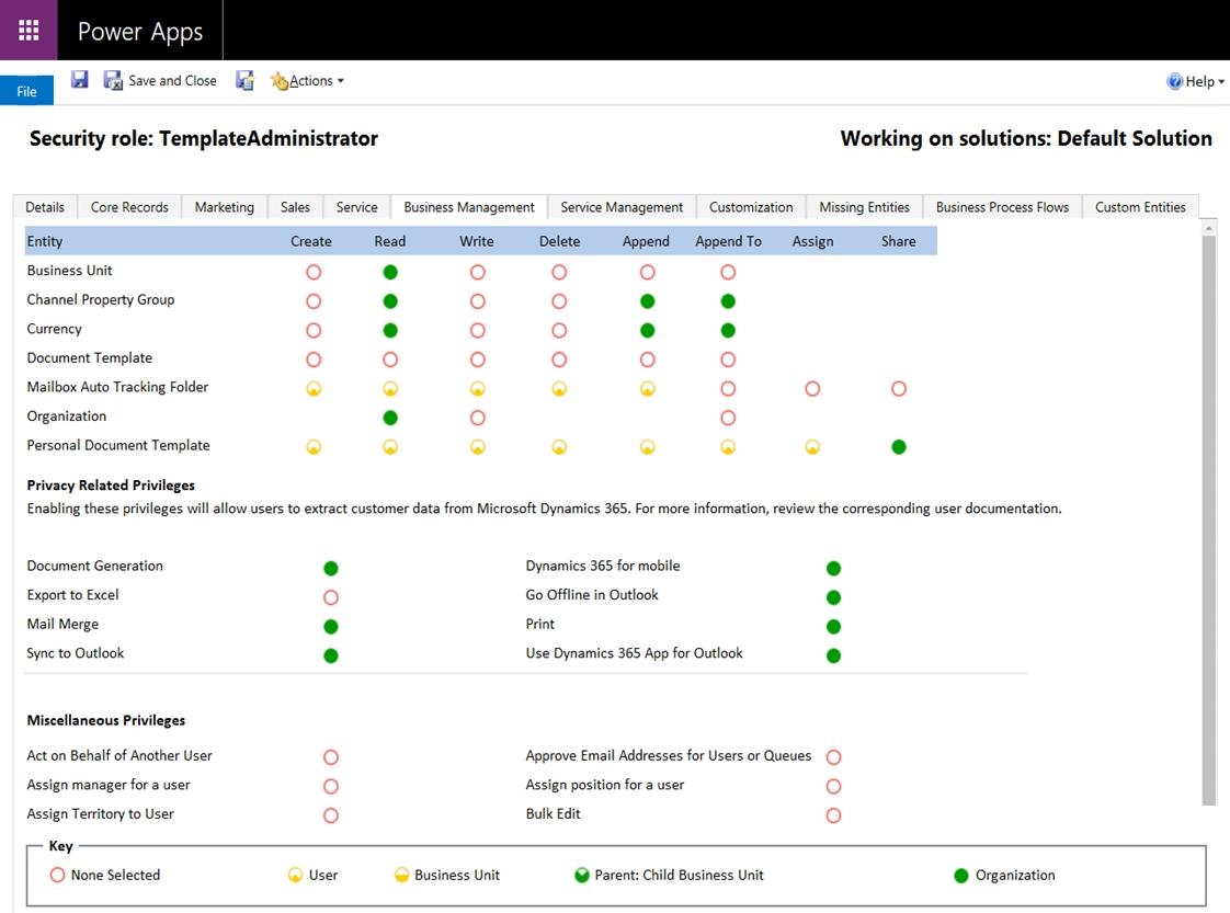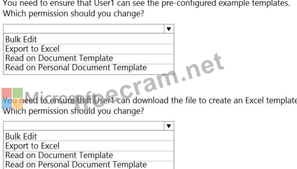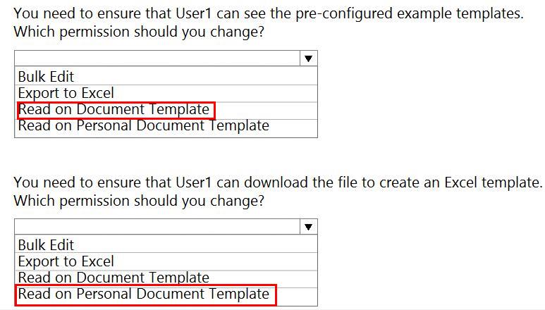 You create a security role named TemplateAdministrator and configure the role as shown below and assign the role to a user named User1.