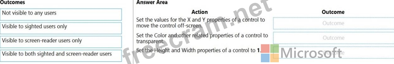 Which outcome is achieved by each action? To answer, drag the appropriate outcomes to the correct actions. Each outcome may be used once, more than once, or not at all. You may need to drag the split bar between panes or scroll to view content.