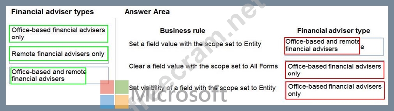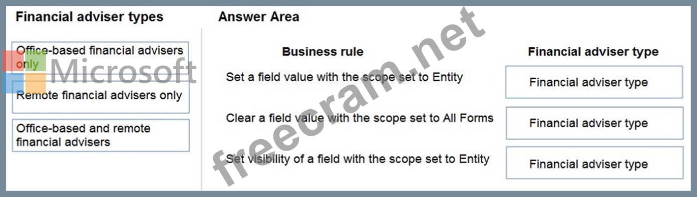 To answer, drag the appropriate financial adviser types to the correct business rules. Each financial adviser type may be used once, more than once, or not at all. You may need to drag the split bat between panes or scroll to view content.
