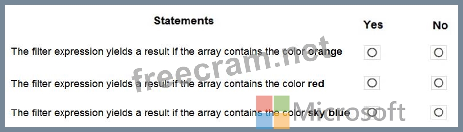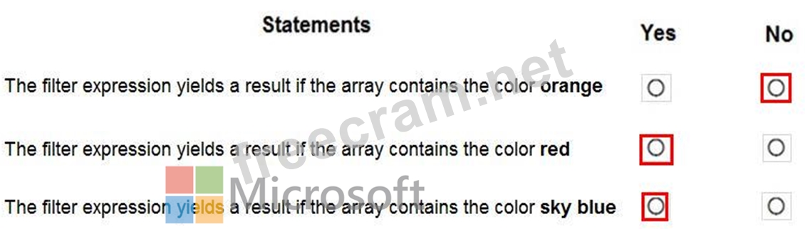 You have an array that contains items with different color attributes. You plan to filter the array by using the following filter expression within the flow: