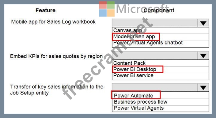 Which Power Platform component should you use for each feature? To answer, select the appropriate options in the answer area.