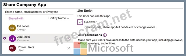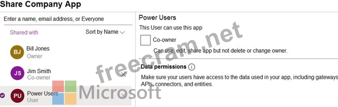 A user named Bill Jones creates a canvas app and shares it with other users in his company as shown in SharePowerUsers and ShareJimSmith exhibits. (Click theSharePowerUsers tab and theShareJimSmithtab.)