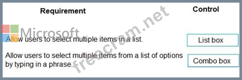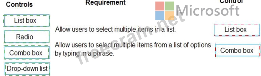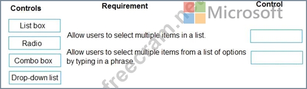 Which control should you use? To answer, drag the appropriate controls to the correct requirements. Each control may be used once, more than once, or not at all. You may need to drag the split bar between panes or scroll to view content.
