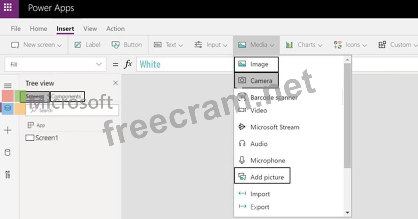 To insert the Camera control in your PowerApps program you can use the blank screen, and select Insert->Media->Camera.